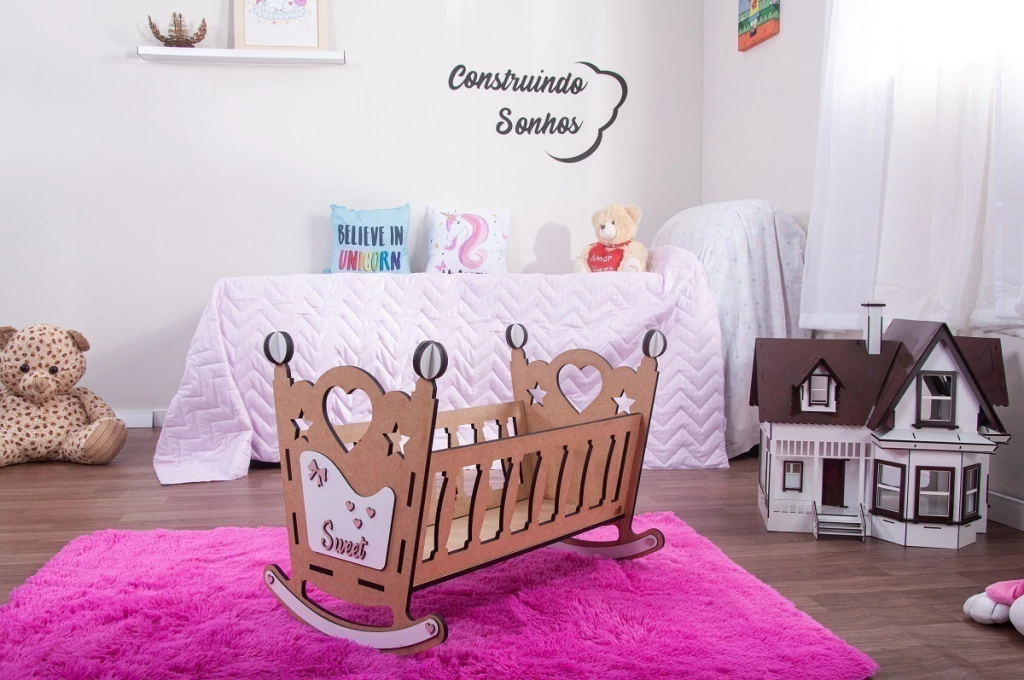 ESTE LINDO BERÇO FABRICADO EM MDF DE 9MM, COM DETALHES CORTADOS EM MDF 3MM, JÁ PINTADS E ENVERNIZADOS É IDEAL PARA SUAS TARDES DE DIVERSÕES. PODE SER UTILIZADO COM BONECAS DE ATÉ 60 CM DE COMPRIMENTO E 24 CM DE LARGURA. BEM RESISTENTE, O BERÇO É FABRICADO COM MDF DE PINUS DE 9MM, GARANTINDO UMA DURABILIDADE SUPERIOR AO PRODUTO.