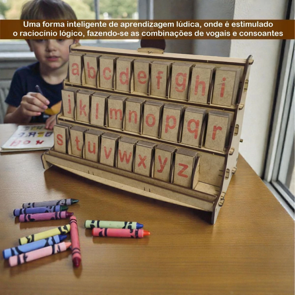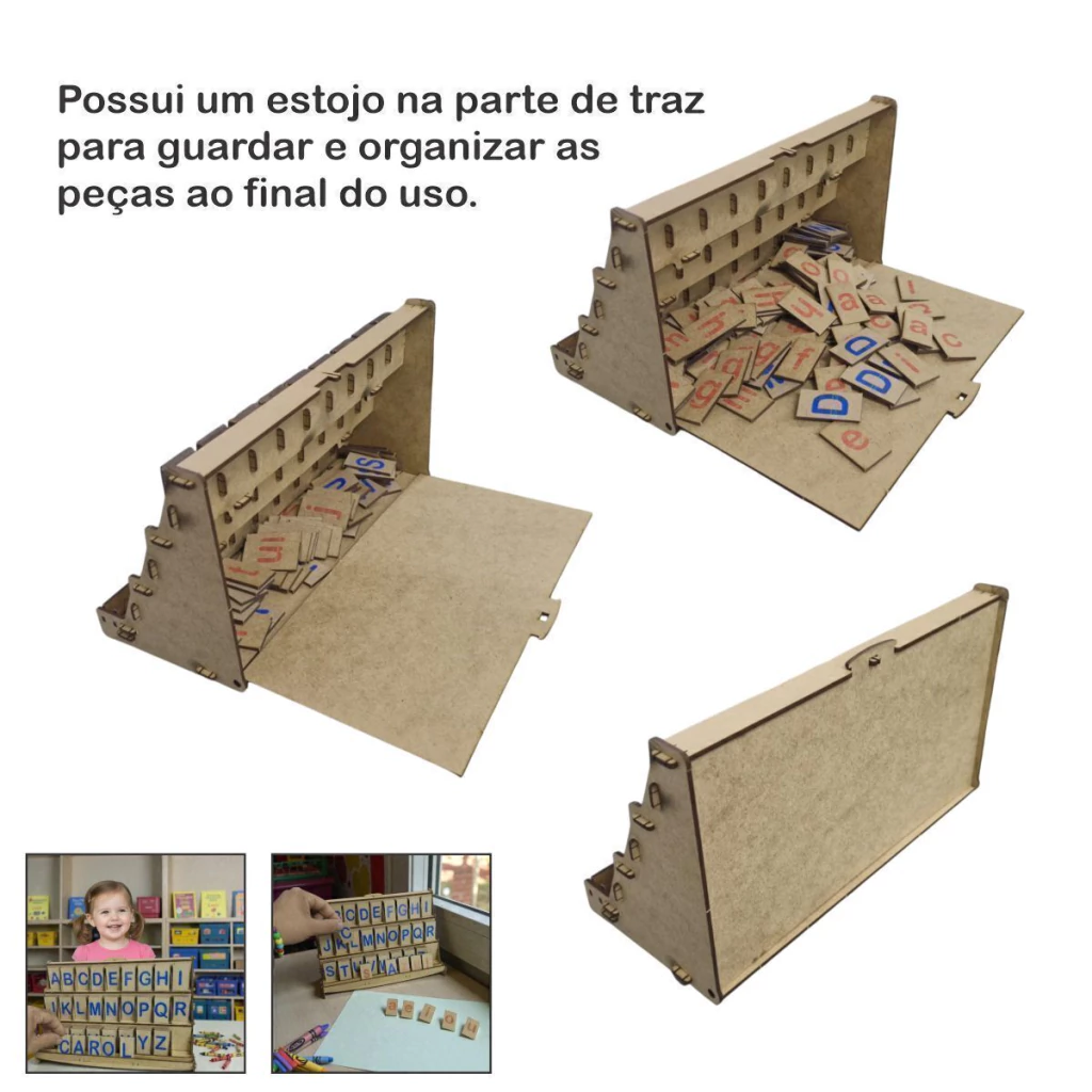 Este suporte educativo com letras móveis é perfeito para crianças em fase de aprendizagem, escolas, clínicas, brinquedotecas e uso terapêutico.