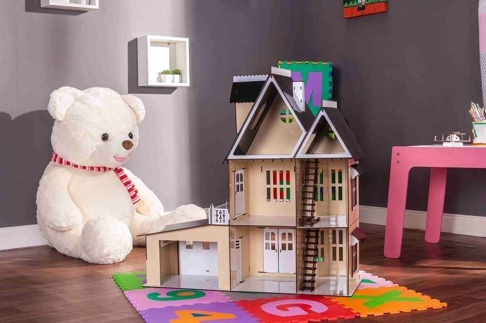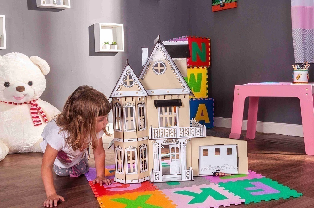 Confeccionada em mdf de 3 mm,a casinha de bonecas é composta por diversas peças,as quais se encaixam sutilmente devido a precisão de corte dos mesmos. Não acompanha móveis.