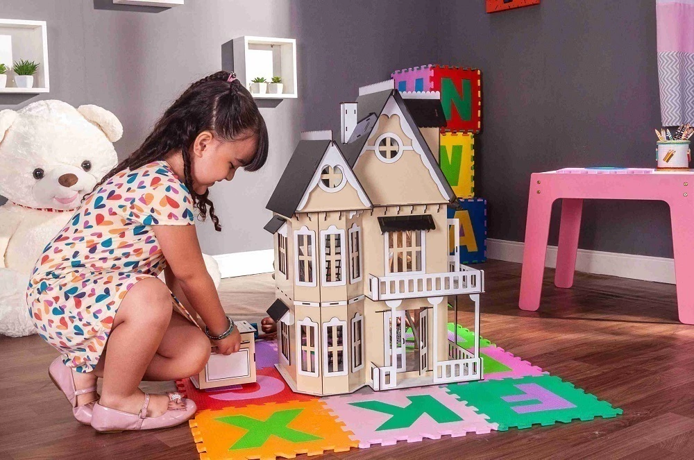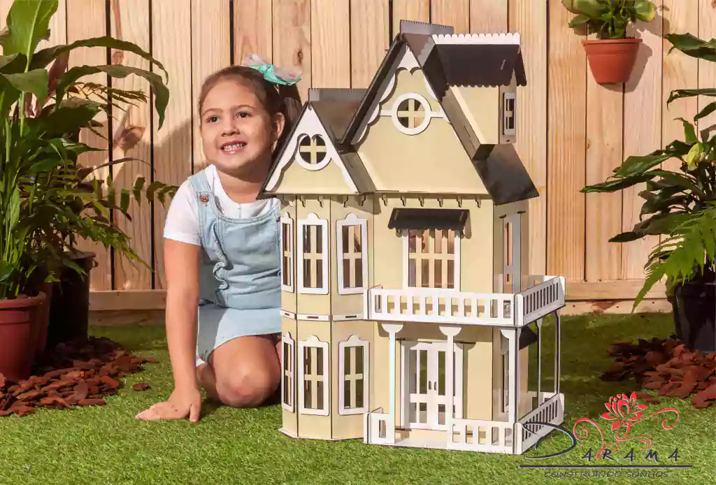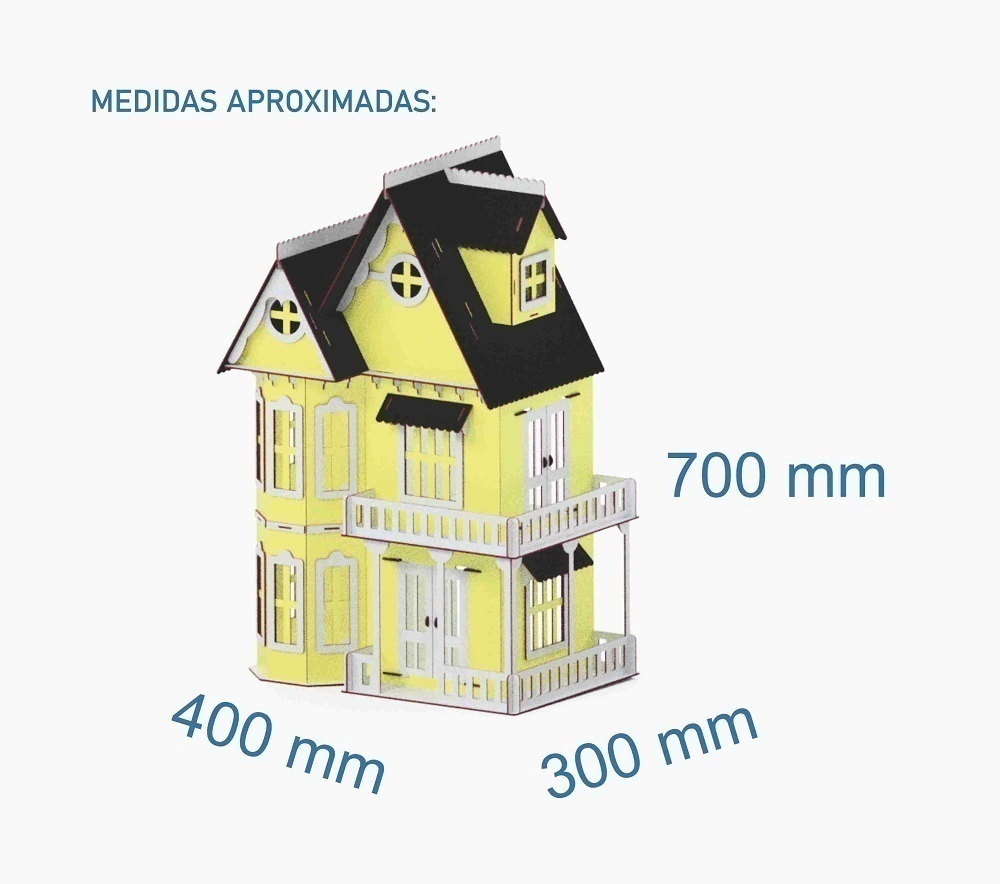 Confeccionada em mdf de 3 mm,a casinha de bonecas é composta por diversas peças,as quais se encaixam sutilmente devido a precisão de corte dos mesmos. Não acompanha móveis.
