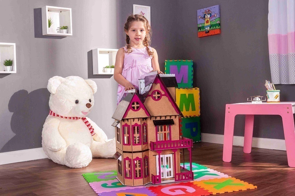 Confeccionada em mdf de 3 mm,a casinha de bonecas é composta por diversas peças,as quais se encaixam sutilmente devido a precisão de corte dos mesmos. Não acompanha móveis.