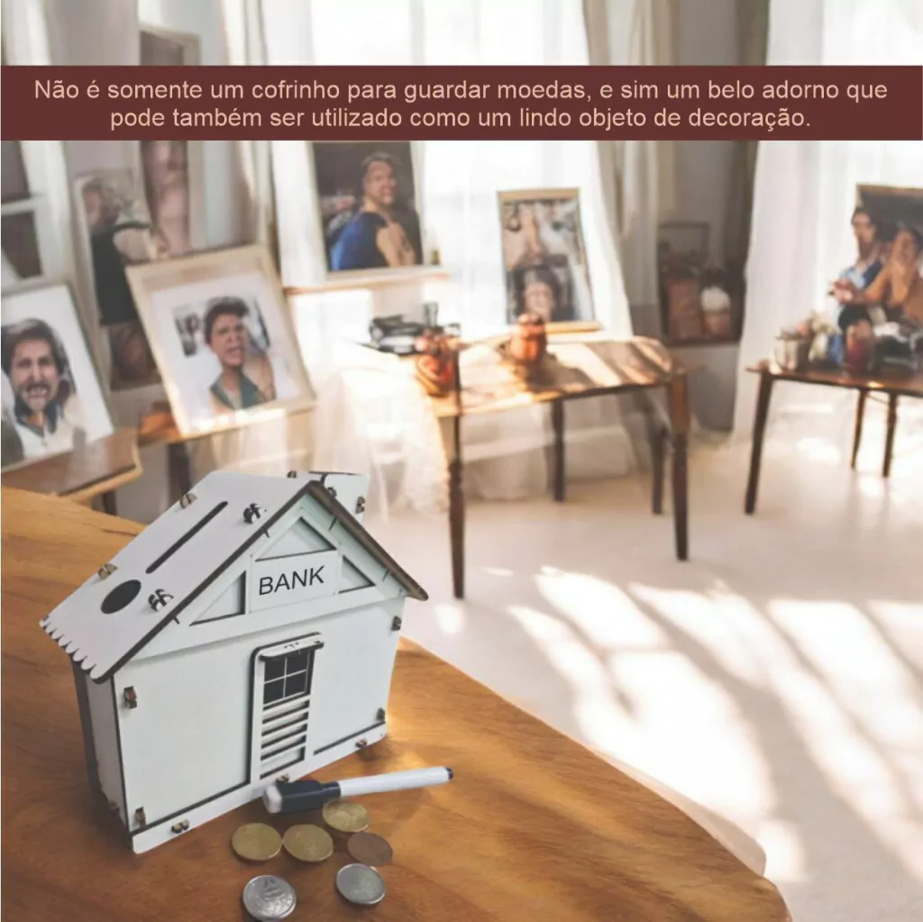 É uma caixa de madeira estilizada e funcional, com design decorativo, usada para armazenar dinheiro de maneira criativa e planejada.