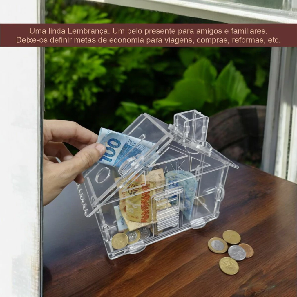 É uma caixa de acrílico estilizada e funcional, com design decorativo, usada para armazenar dinheiro de maneira criativa e planejada.