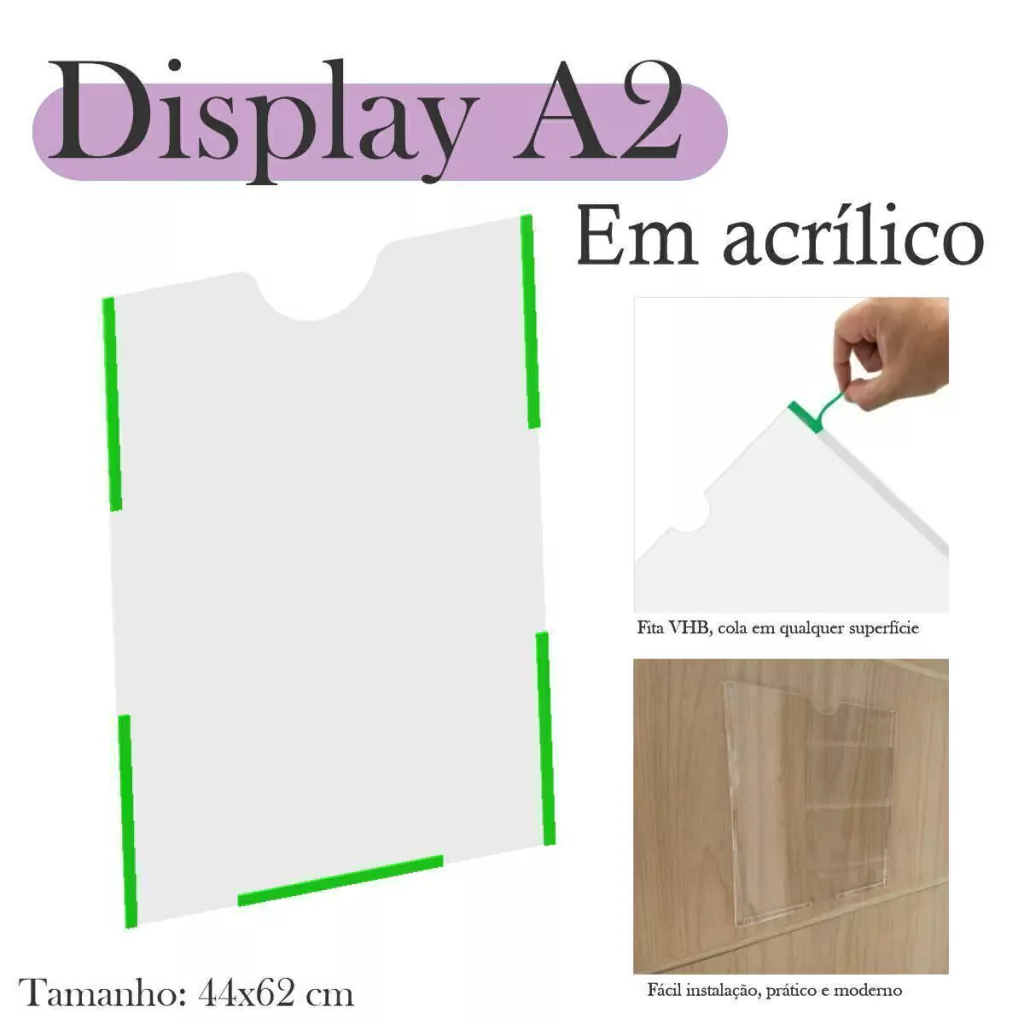 Display Porta Folha A2 Vertical em Acrílico Cristal com fita dupla face.