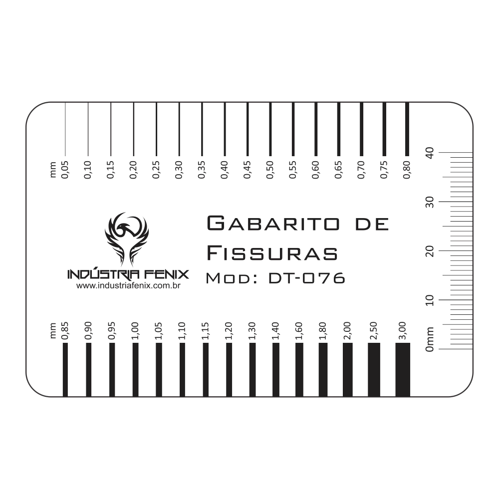 Fissurômetro modelo 4 Fabrica em PVC transparente dimensões de 85 x 55 mm escala de precisão com bordas polidas e fino acabamento.