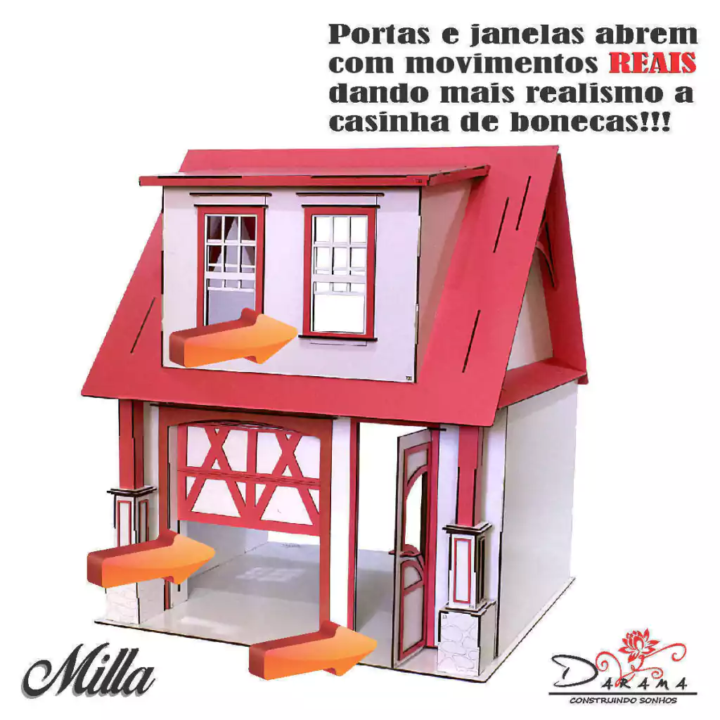 A casa modelo Milla possui dimensão total de 60 cm de comprimentos por 56 centimetros de profundidade, e 70 centimetros de altura, comportando bonecas de até 30 cm de altura como as da linha Barbie e similares.