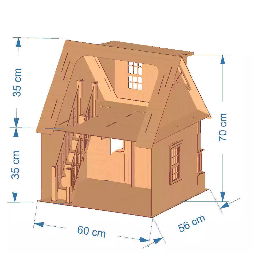 Ela é composta por 2 cômodos amplos, sendo ambos de 35 cm de altura. Possui ainda uma varanda na parte frontal com espaçamento de 10 cm, ideal para que sua boneca possa circular tranquilamente na parte interna.