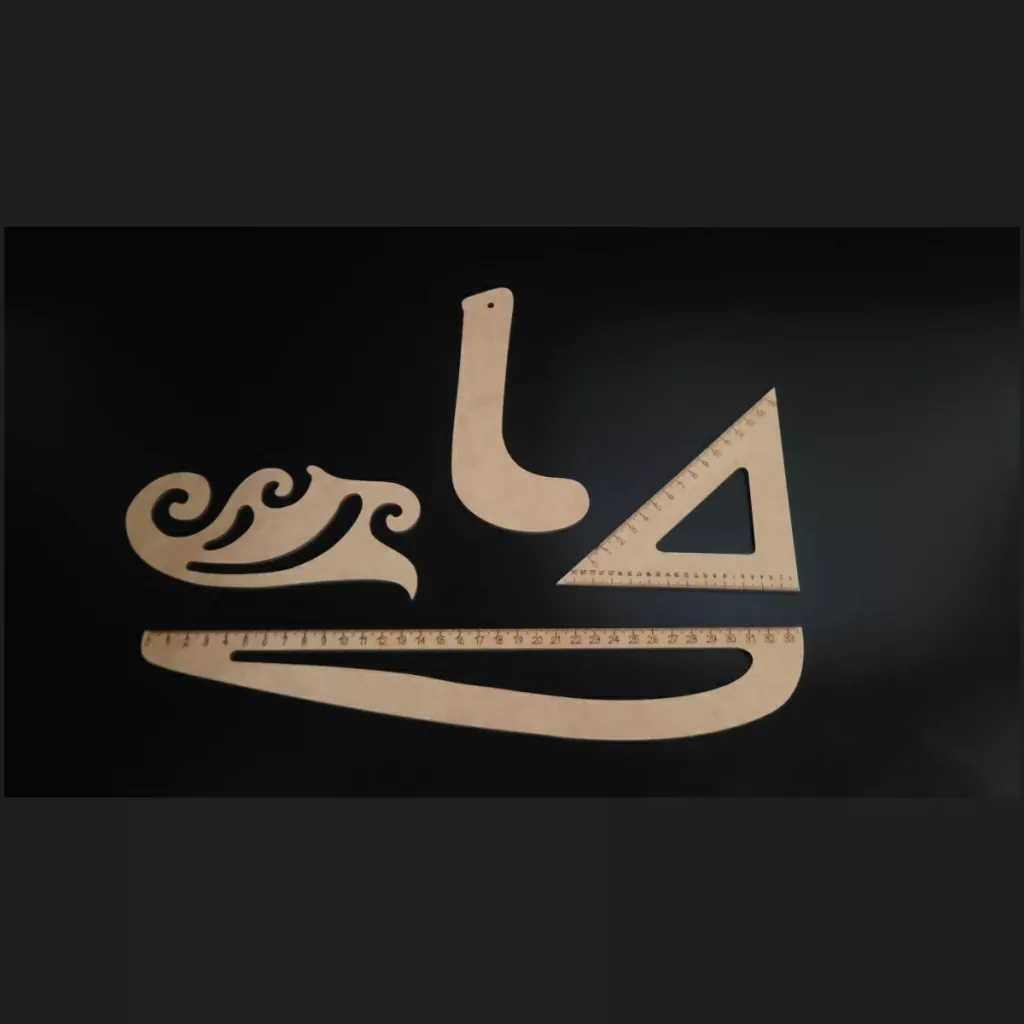 Composto por quatro réguas: Alfaiate Cava Alta Grande, Curva Francesa Grande, Curva Cava Larga e Esquadro de 45º Grande.